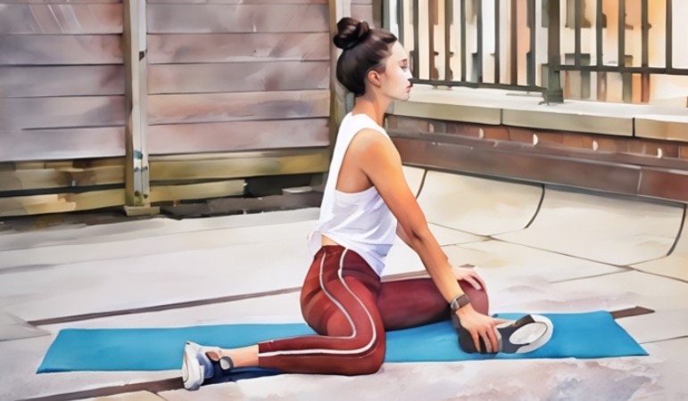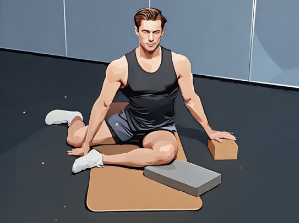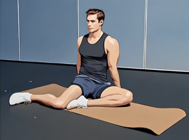 - 바닥에 앉아 왼쪽 다리를 앞으로, 오른쪽 다리를 뒤로 뻗습니다.
